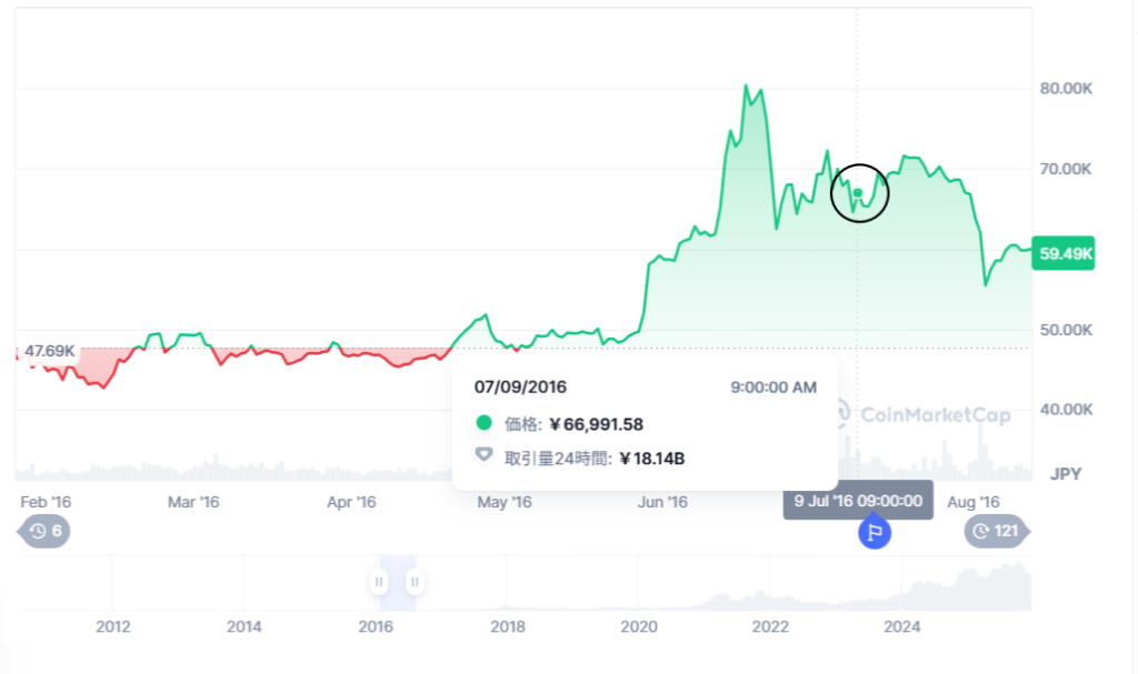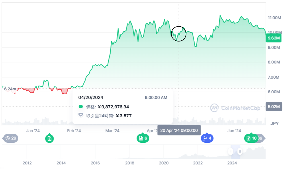 2024年4月の4回目では報酬が3.125BTCに減少し、米国ETF承認の影響もあり1,000万円を突破しました。