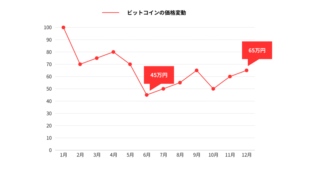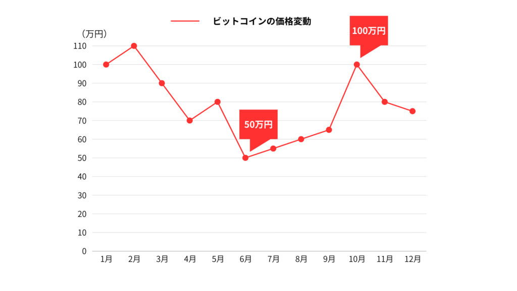 以下の表は、1年間のビットコインの価格変動を仮定したものです。
